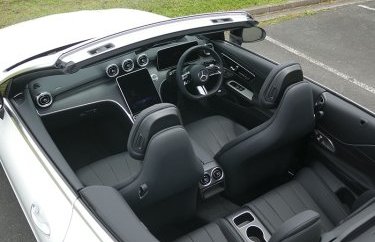 A strip of three buttons for the folding roof and Aircap are nicely integrated on the centre console and could not be better presented. Roof operation is quick and quiet and the large canvas hood stows ever-so-neatly in the boot space, preserving the CLE’s good looks whether the roof is up or down. Heated leather seats with massage function up front ensure the luxury convertible brief is fulfilled and yes, you can seat a couple of passengers in the back providing the driver is not too tall.
